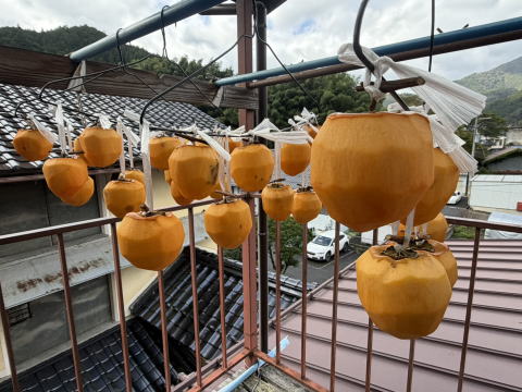 初冬の風景です。干し柿作りが始まりました。今年は暑かったので、まだ早いのかなと思っていたら、今年は遅いなと怒られました。これも先週に引き続き、飛騨の話になりますが、10月中旬に、高山に行ったとき、美濃柿がいろんな所にたくさん干してあり、誰もが早いなと思ったんですが、美濃柿は早い方がいいのではと思い、かえってしたところ、暑い方が早く乾き、いいと解り、それ以来美濃柿は早く干し出しました。もうすぐおこたをし始めますが、その中で食べる干し柿っておいしいですね。当店のお客さんも何人か干し上がるのを待たれているお客さんがおられ。渋い柿がなんでこんなに甘くなるんだろうと思います。一番最初に干した人は本当に賢い人ですね。美濃柿って熟して食べるものだと思っていました。干し柿は西条柿でするものだ思っていました。いろんな所に行って、勉強させされることが多かったです。私も西日本は以前の仕事の関係でいろんな所に行きましたがとんぼ返りが多く、もったいないことしました。下関まではよく行っていたんですが、九州は福岡支店があるので、行かなかったですが、家族で、福岡に行ったとき、それまで、福岡は修学旅行しか行ったことがなく、下関に福岡までこんなに近かったのだから、行きたかったなと、思いました。博多ラーメン食べに。