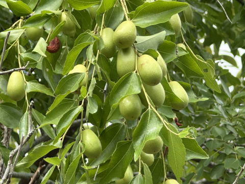 若い人はこれ何という人がほとんどだと思います。「なつめ」と言う実で、私達小さい頃はもう少し、茶色くなると甘くなり、食べていました。リンゴのような味がして美味しかったです。お茶道具のお茶入れはナツメと言われる道具がありますが、形が実の形に似ているからそう呼ばれるようになったと思います。私は木の大きさを知らないから、そのお茶入れはナツメの木から作っているものだと思っていましたが、木を見たとき、こんな木ではお茶入れなんか作れないはと思いました。