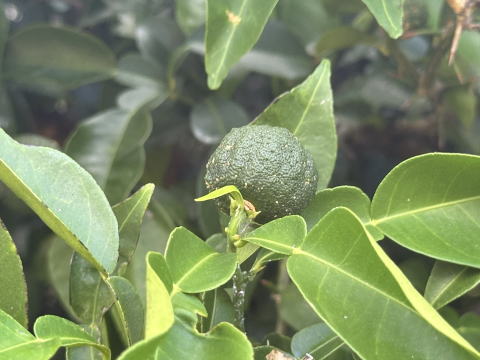 もう柚子が顔を出していました。去年は少なかったんですが、今年はどうなんですかね。日本料理には主役にはなれませんが、なくてはならない材料のひとつです。魚料理の魚のにおいけしにも使われ、生姜と同じような役割をしてくれます。木になっている時柑橘類だとわかるんですが、なんだろうなと思われたら、葉を見たらすぐわかります。葉のつけ根の所がくびれていて、柚子だということがわかります。柚子がたくさん出来たときは、ジャムにしたらとてもおいしいです。パンにもよく合います。