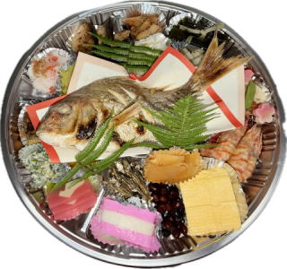 伊勢エビの磯辺風味黄金焼き 日の出かまぼこ 数の子 ゆず釜 子持ち昆布菜の花辛子和え 海老身丈 田作り 子持ち鮎の有馬煮 丹波黒ぶどう豆 のし梅 |