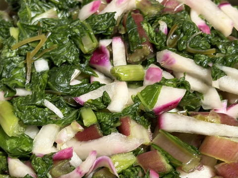 私は赤カブの浅漬けが大好きで、赤カブが大きくなったら作ってくれます。2年前までは皆様にもおいしさを知っていただきたいと安価で販売していました、食品衛生法が改正になり、漬け物は許可業種になり、当店では料理では提供出来るんですが、販売が出来なくなりました。こんなおしい漬け物もあるんだと知っていただきたいのに本当に残念です。
