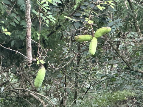 これはアケビです。これから薄紫になり、中に種が綿みたいなものにおおわれ、その綿みたいな白いものがとても甘く、私の小さい頃は、松茸を採りに行くときの楽しみはアケビをとるのが楽しみで松茸採りに行っていました。いまだにその習性があるのか、あの木にはアケビがあるだろうなと思うところにだいたいあります。経験のない人にはアケビは見つけられないと思います。今年はまだ色づくのが遅く、例年なら、色づいて、鳥たちも甘くなるのを知っていて、鳥たちと見つけるのが競争になるんですが、色づくのが今年は少し遅いようです。